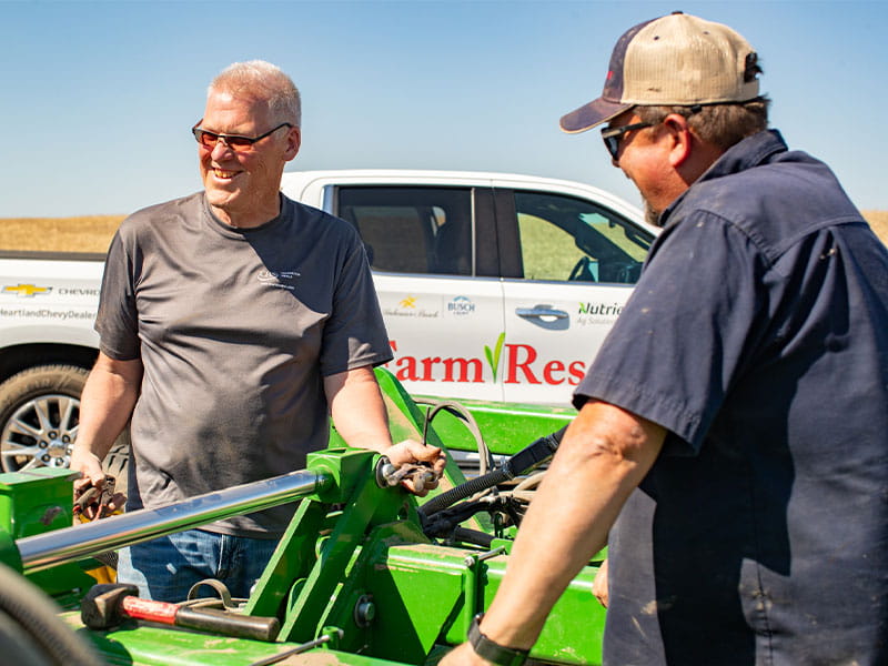 Jim Engelhart, left, helps Farm Rescue volunteer Wade Peterson, Baraboo, Wis., replace a broken bolt on an air seeder.