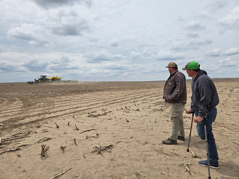 Drew Fish, left, Waterloo, Iowa, and Justin Schemm, Wallace, Kan., watch David Endorf, Daykin, Neb., plant corn for Schemm in early May 2025 using Schemm’s equipment. Fish and Endorf are Farm Rescue volunteers.